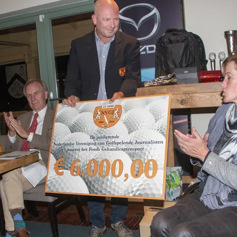 De Mazda Masters, de slotdag van het seizoen op de Goyer Golf & Countryclub, kreeg een extra feestelijk tintje door de overhandiging van een cheque van zesduizend euro aan de ambassadrice van het Sportfonds Golf van het Fonds Gehandicaptensport, Monique Kalkman.