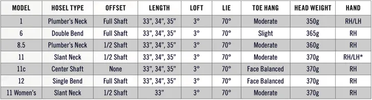 De Huntington Beach SOFT putters zijn beschikbaar in zes bekende designs die passen bij verschillende soorten puttingstrokes. Er zijn twee linkshandige modellen en de 11 is er ook in een vrouwenversie.