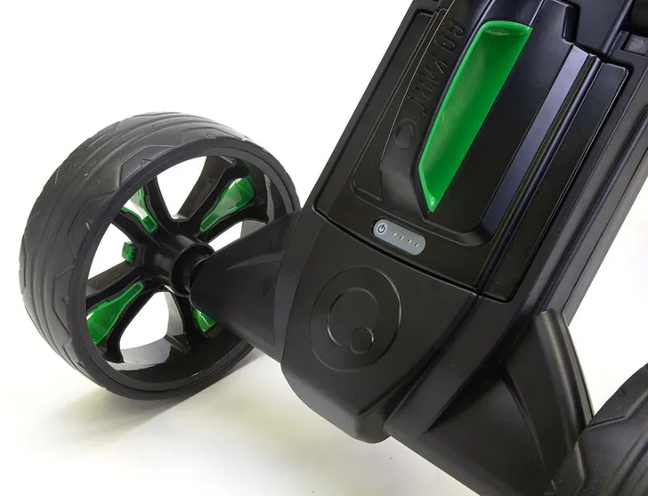 De accu plaats je vervolgens simpelweg in de uitsparing aan de achterkant en kun je – indien gewenst – gewoon laten zitten als je 'm weer opbergt. Je kunt kiezen voor een 18 of 36 holes lithium batterij en een led-indicator geeft aan hoeveel 'prik' je nog hebt.