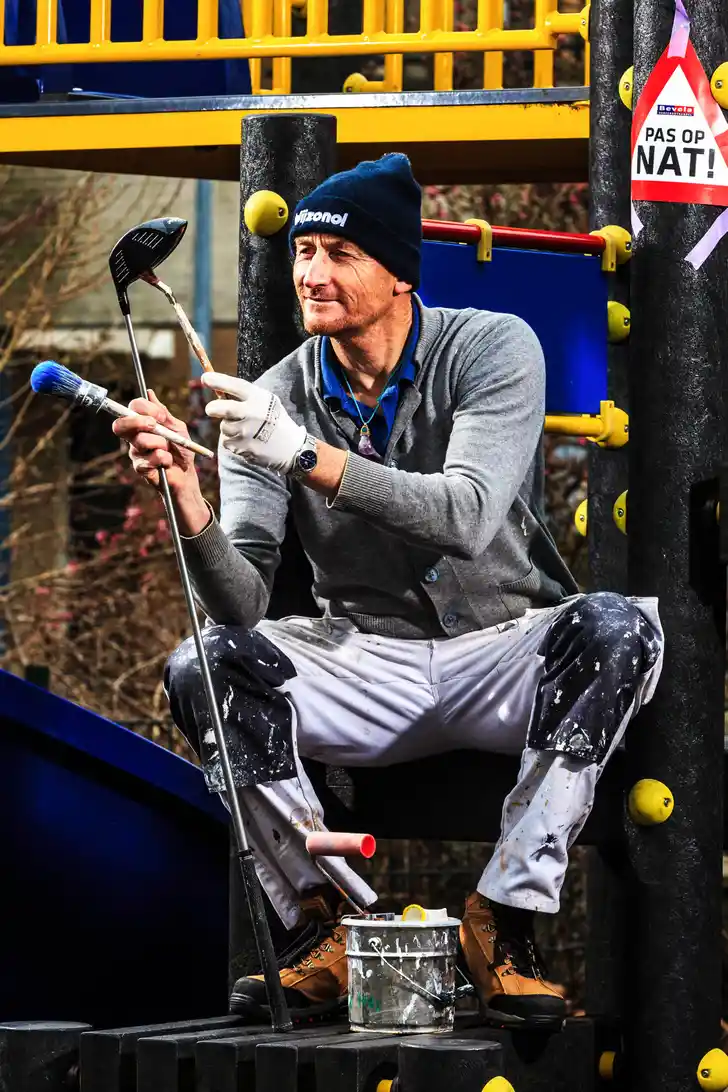 Hij en Saddington zaten in Portugal op het terras naast de achttiende hole te kijken naar al die binnenkomers. ‘Alan zei: “Je moet ervan houden. Tachtig procent van je tijd ben je jezelf aan het martelen.” Zo is het. Je moet een autist zijn, schizofreen. Het is 90 procent shit. De slagen gaan niet zoals je wilt. Ik zag laatst Phil Mickelson winnen, voor mij een goeroe. Vijf jaar niks winnen en dan ineens weer wel. Veel mensen zijn dromers: je wilt winnen. Dat is je ego. Ik dacht: wat doe ik hier nou, een beetje tegen een balletje slaan, wat is de toegevoegde waarde? Helemaal naar Portugal, je neemt je caddie mee, verblijft daar in een mooi huis. Waarom, voor wie, voor je gezin, voor de samenleving?’