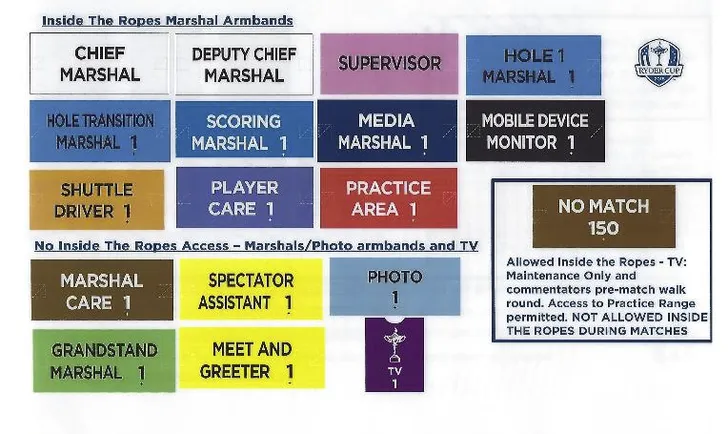 Kilometers blauw nylon touw. En of we ook maar goed willen opletten welke mensen wèl en niet binnen de touwen mogen. Zie hieronder….. en waar het getal 1 staat kan ook 2 t/m 18 staan. Èn dan hebben we het nog niet gehad over VIP-armbanden en veelkleurige koorden waar pasjes aan hangen. … groen, wit roze en geel.