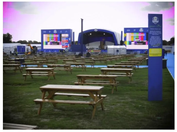 De spanning bij vrijwilligers bouwt zich op naarmate de Motivation Speech dichterbij komt en iedereen om 14:30 op de tribune bij Hole 1 zit. De voorzitter van het Franse RyderCup comité en Thomas Levet bijten het spits af. Maar wat velen echter nog mooier vonden was om Ian Poulter in de RyderCup shop te zien lopen. Heel gewillig ging hij met iedereen die dat wilde op de foto. Henrik Stenson ging met zijn caddie de baan in. De buggy waarin zij zaten maakte regelmatig een stop op het parcours voor een selfie. Dat zegt ook weer wat over de beleving van zo’n topspeler met zoveel tribunes, grandstands, hospitality. Dit is echt indrukwekkend.