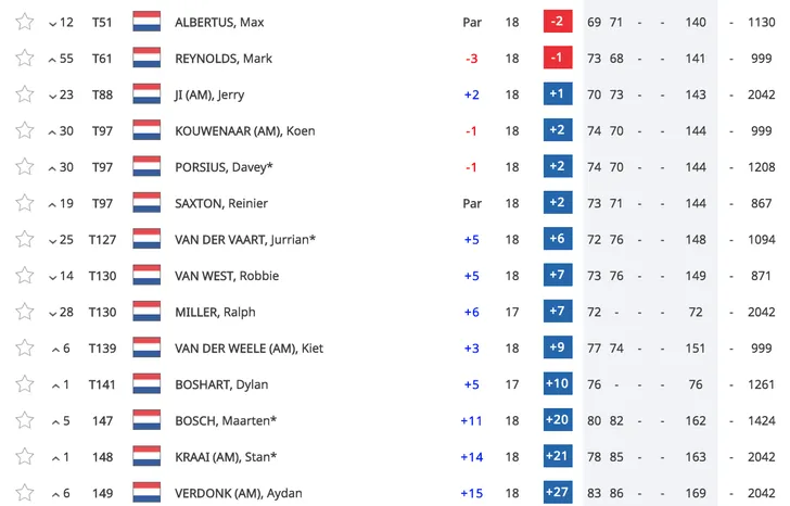 Met een score van -2 is Albertus door naar het weekend, maar écht kansrijk is hij daarin niet; de achterstand op de kop van het veld is immers groot.