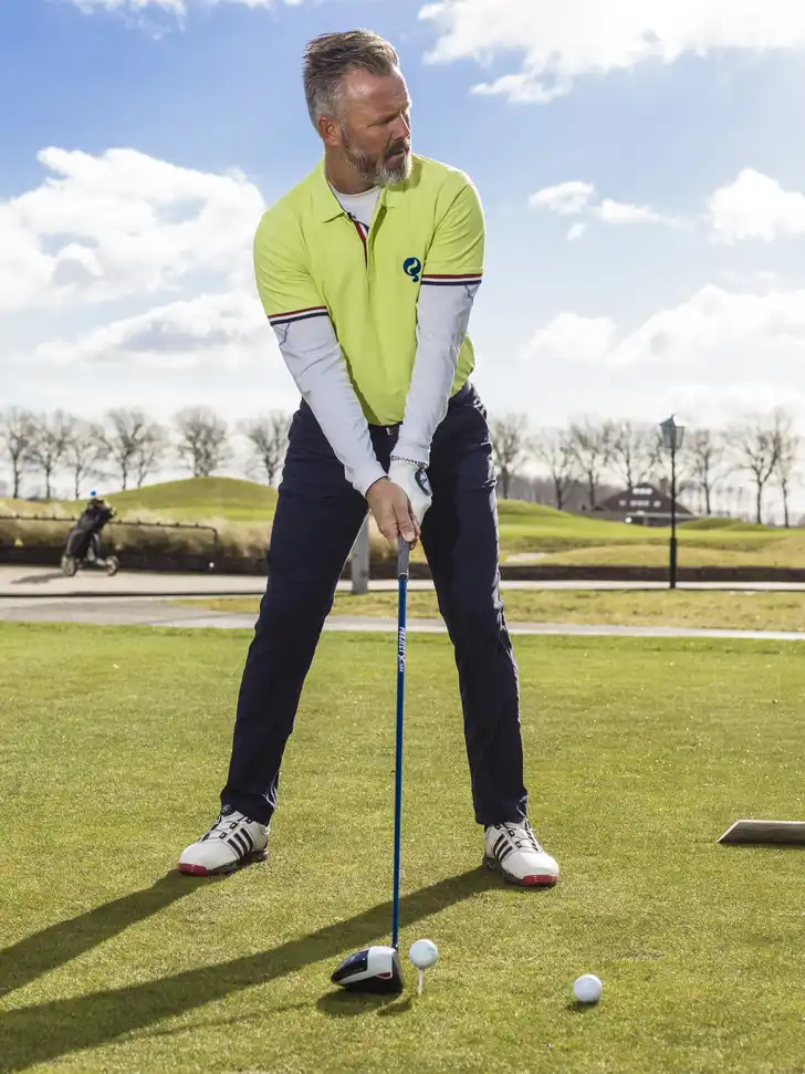 Leg een bal op de grond, een centimeter of tien voor de bal die je wilt slaan, in de lijn naar je doel. Het is bedoeling dat je de voorste bal – netjes opgeteed – raakt zonder dat je de achterste raakt. Het is een normale swing met vanzelfsprekend een correcte eindstand. Ik gebruik deze drill heel vaak, zodat de clubgolfer leert wat de goede manier is om met de driver te slaan. Want als je de achterste bal raakt, dan weet je dat je de voorste in je downswing hebt geraakt.