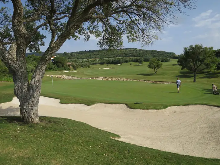 Almenara Sotogrande, zo heet de baan officieel. De 27 holes – los Alcornoques, los Pinos, en los Lagos – liggen in de achtertuin van het gelijknamige resort dat boven op de heuvel ligt en de beschikking heeft over net iets minder dan 150 kamers die stuk voor stuk gebouwd zijn in de stijl van Andalusische villa's. De ruime opzet zorgt ervoor dat je even een stukje moet lopen op weg naar het restaurant, het zwembad of de bar, maar het geeft ook veel privacy en met een beetje geluk een fijn uitzicht op een van de fairways. Het is daarbij waarschijnlijk het enige loopwerk dat je hier doet: we zágen wel mensen lopend door de baan gaan, maar een buggy is geen gek idee op het enorm heuvelachtige terrein.