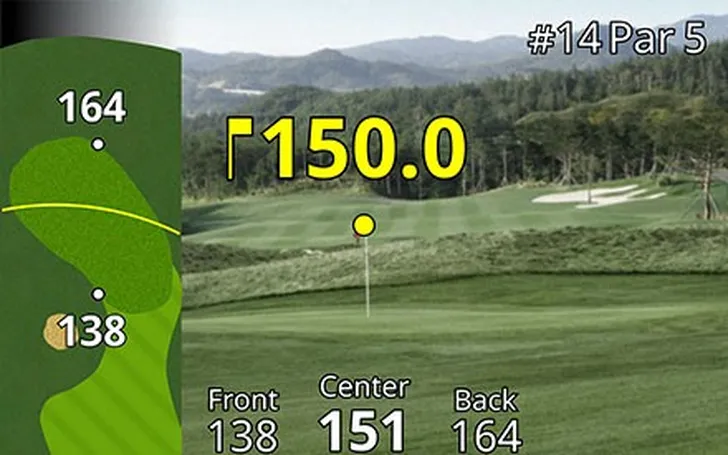 Wanneer je door de afstandsmeter kijkt, zie je de CourseView aan de linkerkant van het beeld, met daarnaast de afstanden tot de hindernissen en de green. Met een druk op de knop meet je de afstand tot de vlag, en tegelijkertijd wordt er ingezoomd en krijg je een 2D weergave van de green (GreenView), met daarbij de afstanden tot het begin, midden en einde van de green.