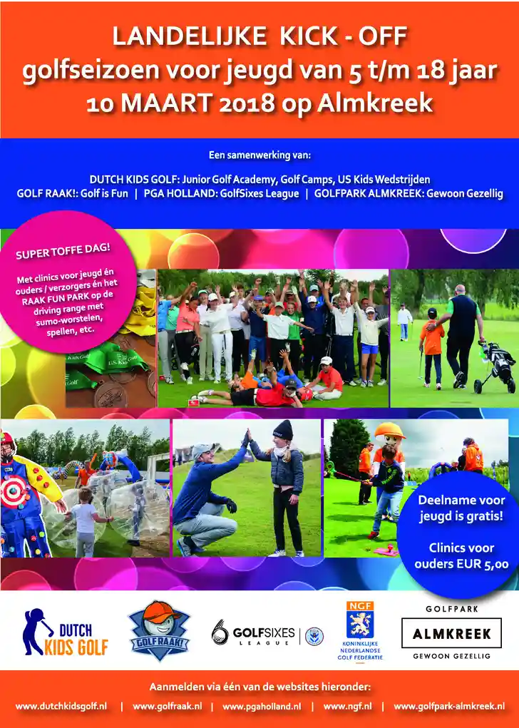 De Nationale Jeugdgolf Kick-Off 2018 is een samenwerking van Dutch Kids Golf, GOLF RAAK!, PGA Holland en Golfpark Almkreek. Toegang is voor alle jeugd geheel gratis.