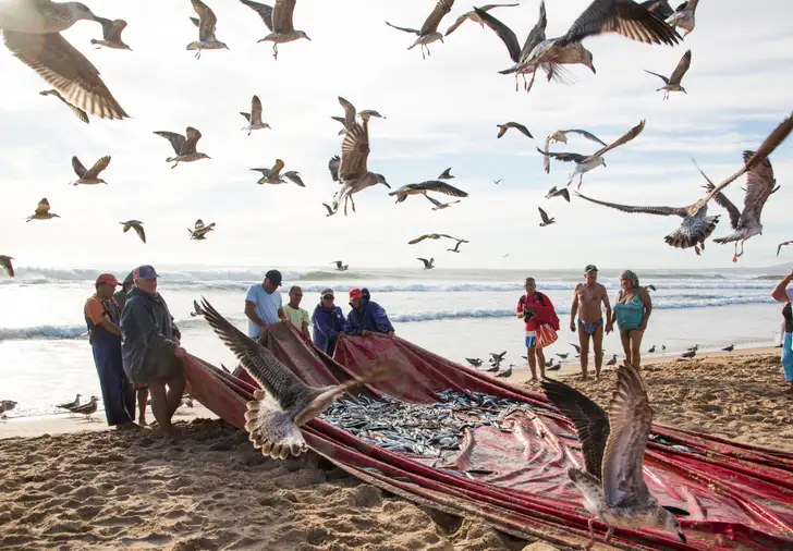 In de buurt van Aroeira is heel wat te zien en te beleven. De kust is prachtig: brede zandstranden en groene heuvels. Tien minuten ten noorden van Aroeira kwamen we terecht in het plaatsje Caparica, net op het moment dat een paar tractoren het strand op reden. Ze gingen de netten binnenhalen die ’s ochtends door een klein motorbootje waren uitgezet. De lijnen werden automatisch door een katrol op de tractor opgerold, maar om alles in goede banen te laten lopen waren er zeker vijftien vissers met een paar vrouwen bij. De tractoren die op honderd meter afstand van elkaar begonnen met binnenhalen, kwamen steeds dichter bij elkaar. Op het moment dat het net bijna uit zee kwam doken er honderden meeuwen op. Het was een machtig gezicht. Het net werd op een immens zeil getrokken en onmiddellijk begonnen de vissers de vis te sorteren in grote bakken. Ondertussen waren er ook heel wat mensen met boodschappentassen aan komen lopen en werd de vis meteen verkocht. Wat overbleef, voornamelijk makreel, ging naar de kleine visfabriek even verderop om verwerkt te worden. De bijvangst werd niet teruggegooid in zee; daar deden de meeuwen zich te goed aan. Het geheel duurde krap een uurtje maar was spectaculair om te zien.