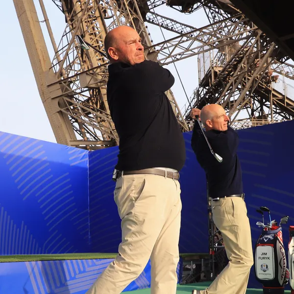 Vandaag sloegen Bjorn en Furyk ballen vanaf het onderste plateau - nog altijd 57 meter boven de grond - van de Eiffeltoren richting de Champ de Mars.