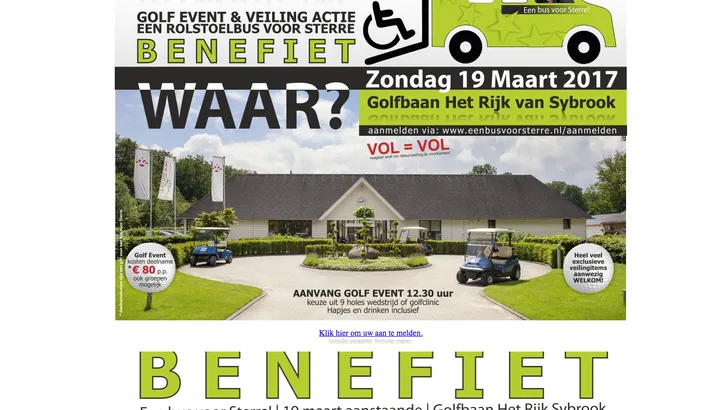 Datum event : 19 Maart 2017. Locatie: Golfbaan het rijk van Sybrook. Adres: Veendijk 100 Enschede. Kosten deelname: € 80,- pp (de opbrengst is bestemd voor de rolstoelbus van Sterre)