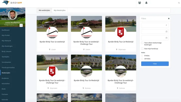 Inschrijven en direct online betalen kan binnen de omgeving van Birdy Club. In deze omgeving vind je naast alle wedstrijden, de mogelijkheid om online starttijden te boeken, scorekaarten voor je eigen administratie bij te houden en je netwerk van golfvrienden op te bouwen. Daarnaast kun je alle informatie over de wedstrijden terug vinden, denk dan aan startlijsten, uitslagen, foto’s van de wedstrijddagen en nog meer. De wedstrijden vinden plaats op De Scherpenbergh, De Drentsche G & CC, De Goyer G & CC, De Kennemer G & CC, Golfbaan Edda Huzid, Het Rijk van Margraten en terug van weggeweest voor de finale, de prachtige Golfsociëteit De Laage Vuursche.