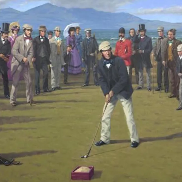 Op het schilderij staat Old Tom Morris die op 17 oktober 1860 de eerste bal slaat op het Schotse Prestwick.