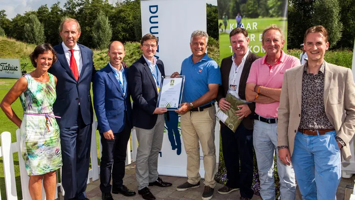 Uit handen van Jonathan Smith (GEO) ontvangt Niek Molenaar, directeur van The Dutch, het internationaal erkende duurzaamheidscertificaat van de Golf Environment Organization (GEO). The Dutch is de drieënzestigste baan in Nederland met dit certificaat. De Nederlandse golfsport blijft hiermee internationaal koploper op het gebied van aandacht voor duurzaam beheer van golfbanen.