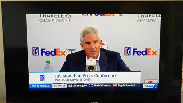 ‘Ik ben niet naïef. Als dit een wapenwedloop is en als de enige wapens hier dollarbiljetten zijn, dan kan de PGA Tour niet wedijveren’, aldus het openingssalvo van Monahan in een nationwide rechtstreeks uitgezonden persconferentie vanaf de baan waar deze week het Travelers Championship wordt gespeeld.