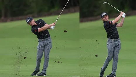 'Bij alle rechtshandige topspelers wijst de linkerarm in de downswing rechts van het doel, waarna de grote spieren in het lichaam het clubblad bij impact haaks op het doel draaien. Ik heb hier een goede oefening voor, die door het gebruik van beweging dynamisch blijft, in plaats van dat je met statische posities werkt.'