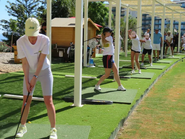 Het is precies om die laatste reden dat de niet-golfende collega's Myrte en Renee zich op de mat van de eigen driving range van het resort melden. Om het eens te proberen. 'Ik heb in Nederland wel eens een club in mijn handen gehad, maar echt gegolfd heb ik nog nooit. Ik wilde het wel een keertje uitproberen, maar om de een of andere reden liep ik in Nederland altijd tegen een drempel aan. Die is hier absoluut niet', zegt een van de jonge twintigers, terwijl haar stem nog maar net boven de muziek uitkomt die uit de speakers op de driving range knalt.
