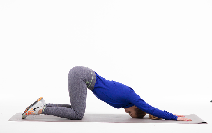 Een oefening die met name goed is voor je hele rug, eigenlijk voor de hele achterkant van je lichaam. Zelfs de voorkant van je bovenlichaam rek je er wat mee op. Veel mensen buigen hun schouders – bijvoorbeeld tijdens computerwerk – te veel naar voren. Met deze oefening verbeter je ook die houding snel. Ga op handen en knieën zitten, met je handen zover mogelijk naar voren. Net zolang tot je heupen boven je knieën zijn en je armen gestrekt. Duw nu je borstbeen nog wat omlaag en naar voren. Als je last hebt van je knie leg er dan gerust iets zachts onder.