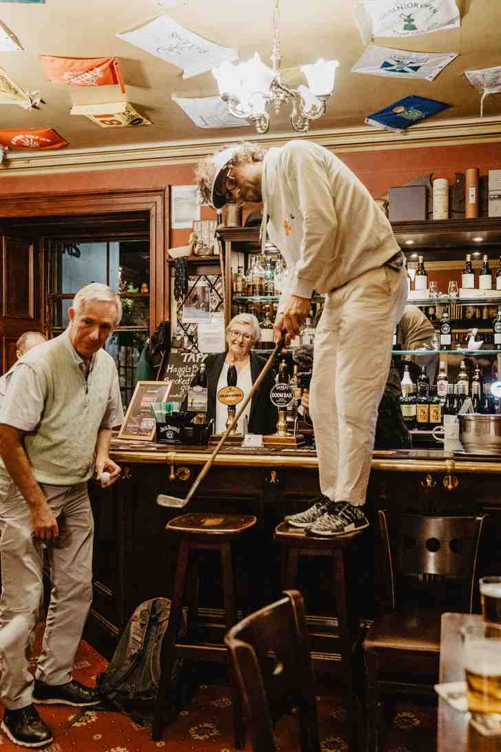 Nee, ook niet in de Duck’s Inn. Al wordt het daar wel leuker. Tenminste, als je van een bar houdt die bol staat van de golfparafernalia. Aan het plafond hangen tientallen holevlaggen ('dat is ooit begonnen om een lekkageplek af te dekken, het liep wat uit de hand'), de muren hangen vol foto's en scorekaarten, en er is alle ruimte voor golfspelletjes. Regelmatig wordt onder aanvoering van Malcolm Duck de pub omgetoverd tot een indoorgolfbaan met de barputting als hoogtepunt van je verblijf. Duck: 'Nee, het gevaar is niet dat mensen op een kruk moeten klimmen, het zijn de rondslingerende balletjes waar je goed op moet letten.' Het is maar goed dat het hotel meer dan twintig kamers heeft die je direct vanuit de kroeg kunt bereiken, want na een dag met 36 holes en een avondje in de Duck's Inn ben je echt wel toe aan slaap.