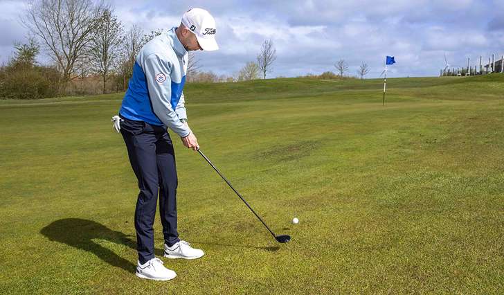 Pas voor deze slag je set-up een beetje aan. Grip de club kort en ga dichter dan normaal bij de bal staan, waardoor de shaft bijna verticaal is. De stand is enigszins open, je voeten staan dicht bij elkaar en de bal ligt net voor het midden. Maak een puttbeweging met alleen je schouders en je armen – hoe minder er beweegt, des te eenvoudiger is het om de bal goed op de sweetspot te raken. Je kunt zelfs je puttgrip gebruiken.