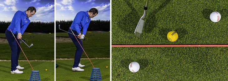 Oefening: Zet een mandje achter de bal, met een oplijnstick in dezelfde hoek als je shaft. In de backswing ga je over de stick heen, en in de downswing trek je de club naar beneden en swing je onder de stick door. Zo train je het gevoel voor een betere swingbaan.