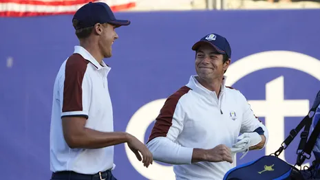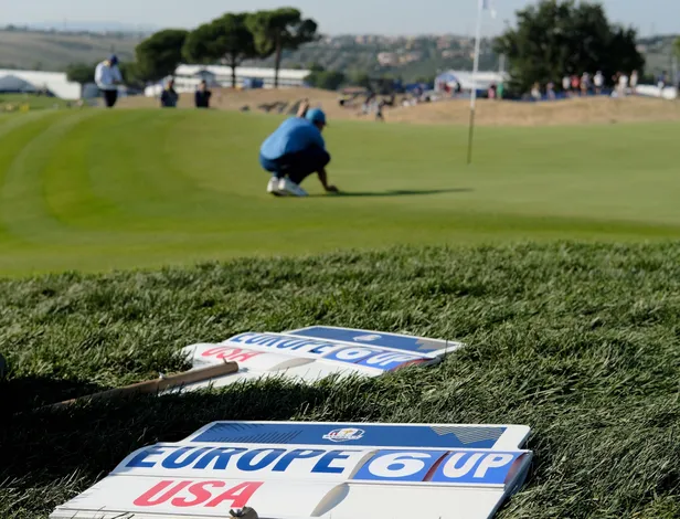 Op het moment dat eindelijk het eerste volle punt voor de Amerikanen bijgeschreven mocht worden, had Europa er echter alweer twee binnen en het was vooral het punt uit de tweede partij dat even indrukwekkend als demoraliserend was. Hovland en Aberg lieten werkelijk geen spaan heel van Scheffler en Koepka die met 9&7 de grootste nederlaag uit de geschiedenis leden. Koepka (die het gisteren nog nodig vond de emotie van Rahm ter discussie te stellen) en Scheffler (in tranen na de oorwassing) waren +6 na negen holes en hadden bij de turn net zo goed rechtdoor kunnen lopen naar het clubhuis.