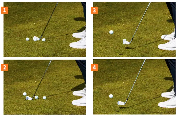 Leg drie ballen een centimeter of vijf van elkaar, in een loodrechte lijn ten opzichte van je doel (1). Adresseer de middelste bal, maar sla vervolgens de dichtstbijzijnde bal (2), dan de verste (3) en tot slot de enige die er nog ligt. Telkens adresseer je de middelste bal. Doe dit met verschillende clubs.