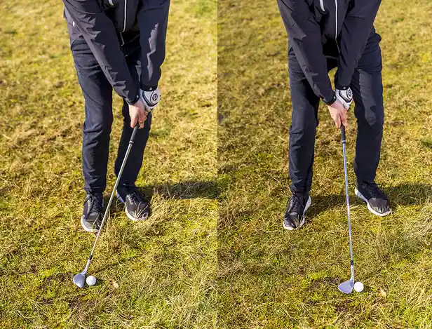 In een poging om eerst de bal te raken maken veel golfers de fout dat ze de bal terug in hun stand spelen, met de handen naar voren (linksboven). Dit resulteert in een steile invalshoek en vergroot de kans op een fluff of skull alleen maar. Ga iets openstaan, hou de shaft verticaal en speel de bal juist iets meer voor in je stand, ter hoogte van je voorste hiel (rechtsboven).