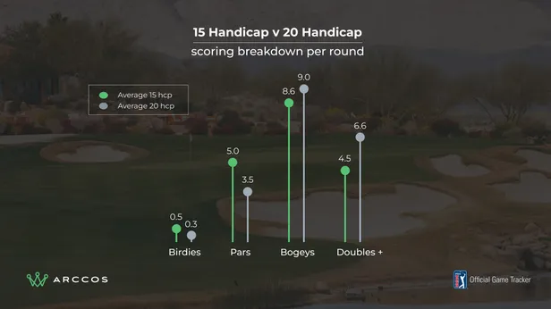 Het verschil in birdies en bogeys is bijna verwaarloosbaar, terwijl de 15-handicapper gemiddeld 1,5 par meer per ronde maakt dan een speler met handicap 20.
