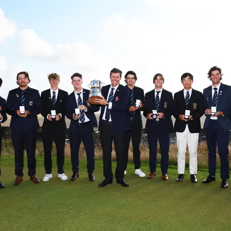 Lars van der Vight en Jerry Ji wonnen de op de slotdag van de St Andrews Trophy hun singles om het continentale team (foto boven) aan een ruime 16 – 9 zege op Groot Brittannie en Ierland te helpen (eindstand).