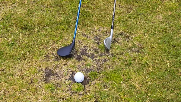Je hebt net de green gemist en de bal heeft een kale, harde ligging. Het wordt lastig om het clubblad onder de bal te krijgen en een hoge pitch te slaan. Kies dus voor de veilige 'lage roller'.