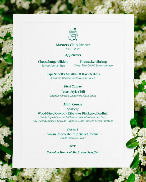 Sandy Lyle presteerde het om zijn gasten in 1989 haggis voor te zetten, Nick Faldo presenteerde in 1997 traditionele fish and chips en Tiger Woods liet met zijn eerste Champions Diner zien dat hij nog maar piepjong was door te kiezen voor cheeseburgers, milkshakes en patat. Hij had zomaar aan Washington Road door de McDrive kunnen rijden, maar het was echt de staf van Augusta National die het maal kookte voor de aanwezige oud-kampioenen. Net zoals ze dat zullen doen voor de kampioen van 2024, Scottie Scheffler.