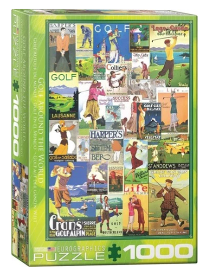 Je ziet ze nog wel eens hangen in het clubhuis, zeker aan de overkant van de Noordzee: van die fraaie oude platen waarop golf een hoofdrol speelt. Als decor voor een reclame voor een locatie, de spoorwegen of een tijdschrift. Heel mooi om die print zelf aan de muur te hebben, maar welke moet je kiezen? Daar kan je tijdens het puzzelen aan Golf around the world rustig over nadenken.