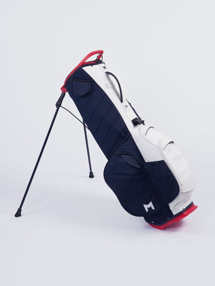 Gemaakt van afgedankte visnetten en voorzien van magneetsluitingen in plaats van ritsen (een kwetsbaar onderdeel van golftassen). Dubbel duurzaam dus. De M Comp SG1 heeft vier vakken voor je clubs, zeven vakken voor kleding, ballen en accessoires en een vak om je telefoon in te zetten zodat je je swing kunt filmen. Prijs: € 330