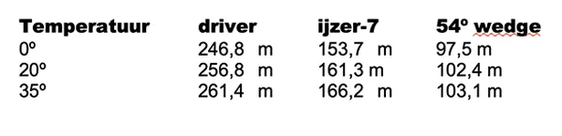 Je kunt deze informatie gebruiken om voor elke club de verwachte carry bij verschillende temperaturen aan te passen. Zoek uit hoe ver je een club normaal gesproken slaat bij een bepaalde temperatuur en gebruik deze verhoudingen om de carry aan te passen bij 10º of 15º temperatuurverschil. Dit maakt je accurater in de baan.
